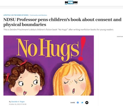Danielle A. Teigen, managing editor of the INFORUM newspaper section ‘On the Minds of Moms,’ wrote an article about No Hugs! in October 2022 titled: ‘NDSU Professor pens children’s book about consent and physical boundaries.’